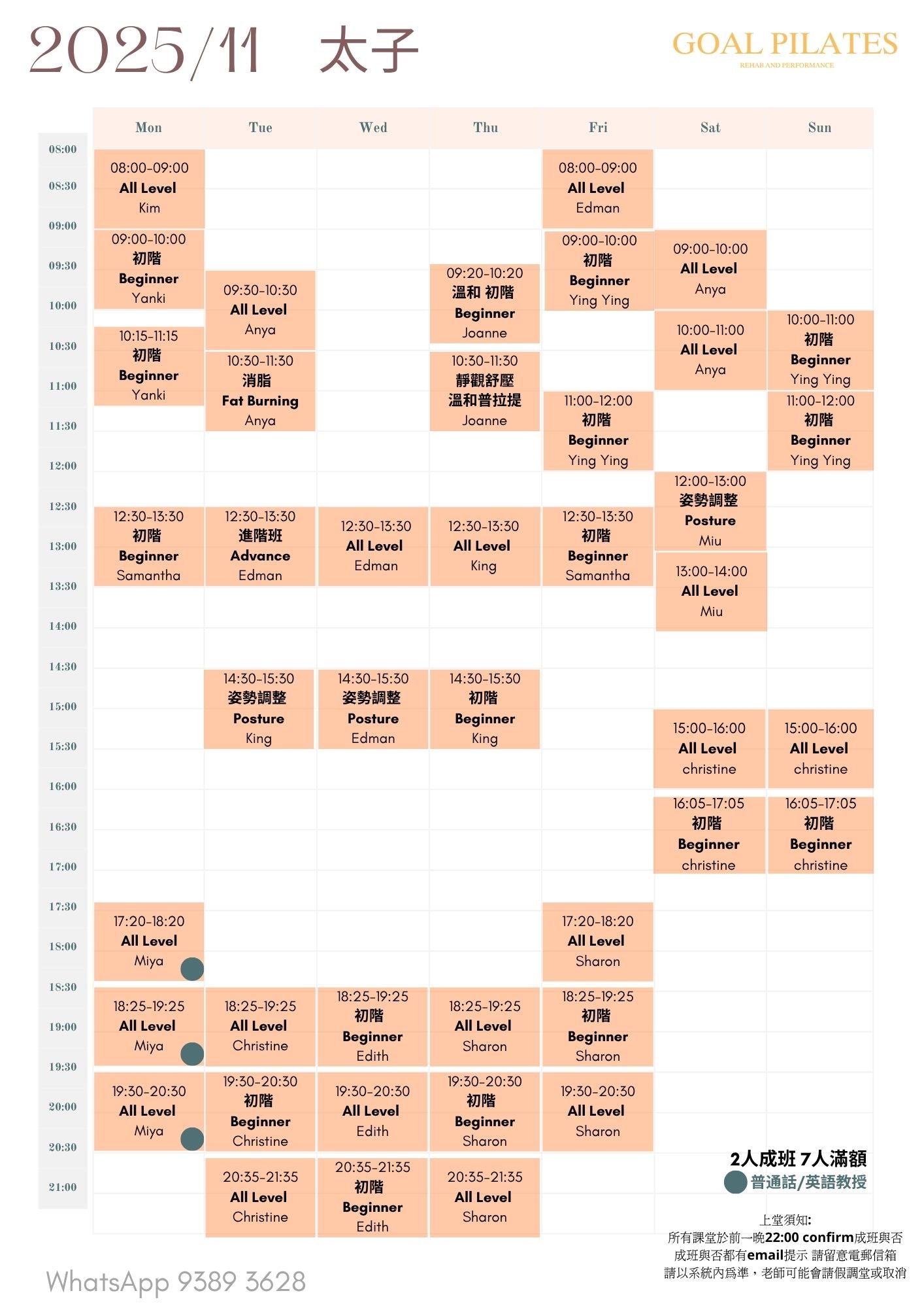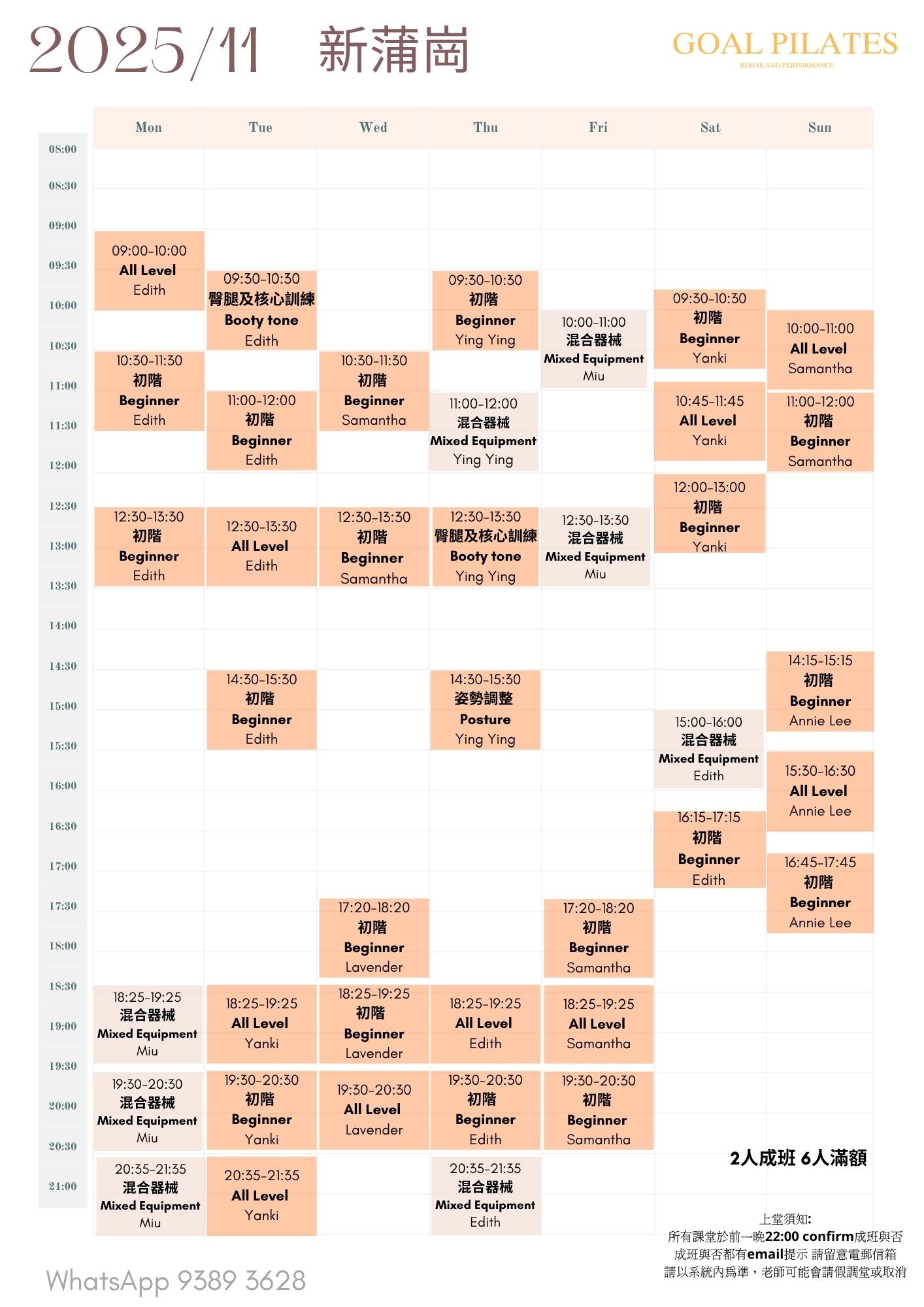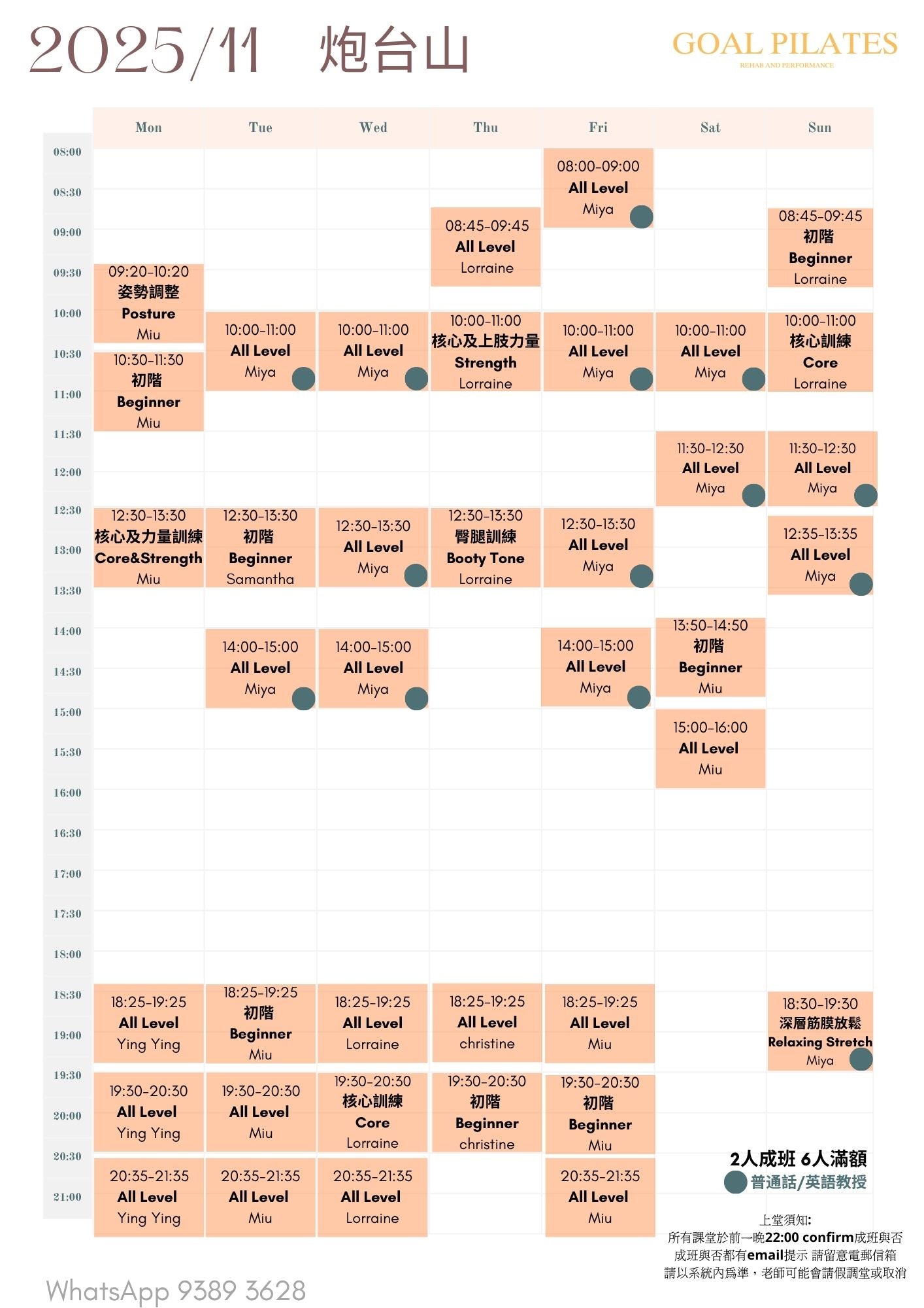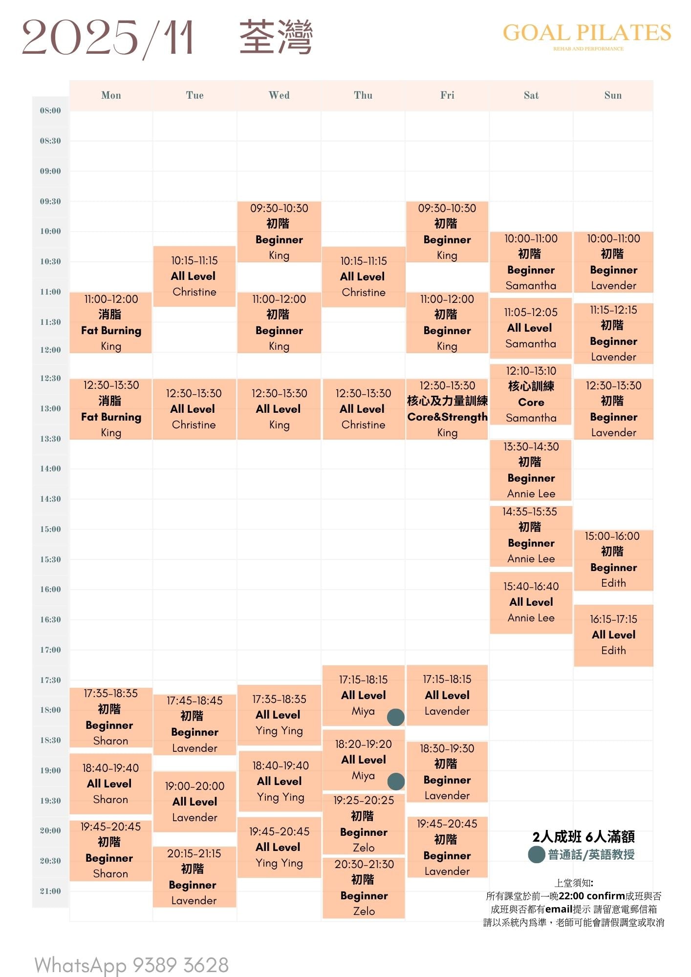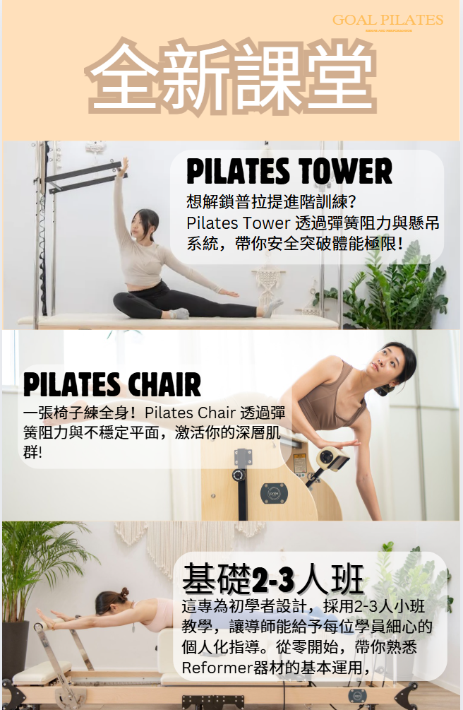 無論你是初學者、運動愛好者,還是專業運動員,Goal Pilates都是你理想的訓練夥伴。我們提供不同小組課堂,協助改善姿勢、增強核心力量、提升柔軟度。從恢復期到強化期,提供安全、有效的運動體驗。打造適合你需求的健康生活,就從這裡開始!