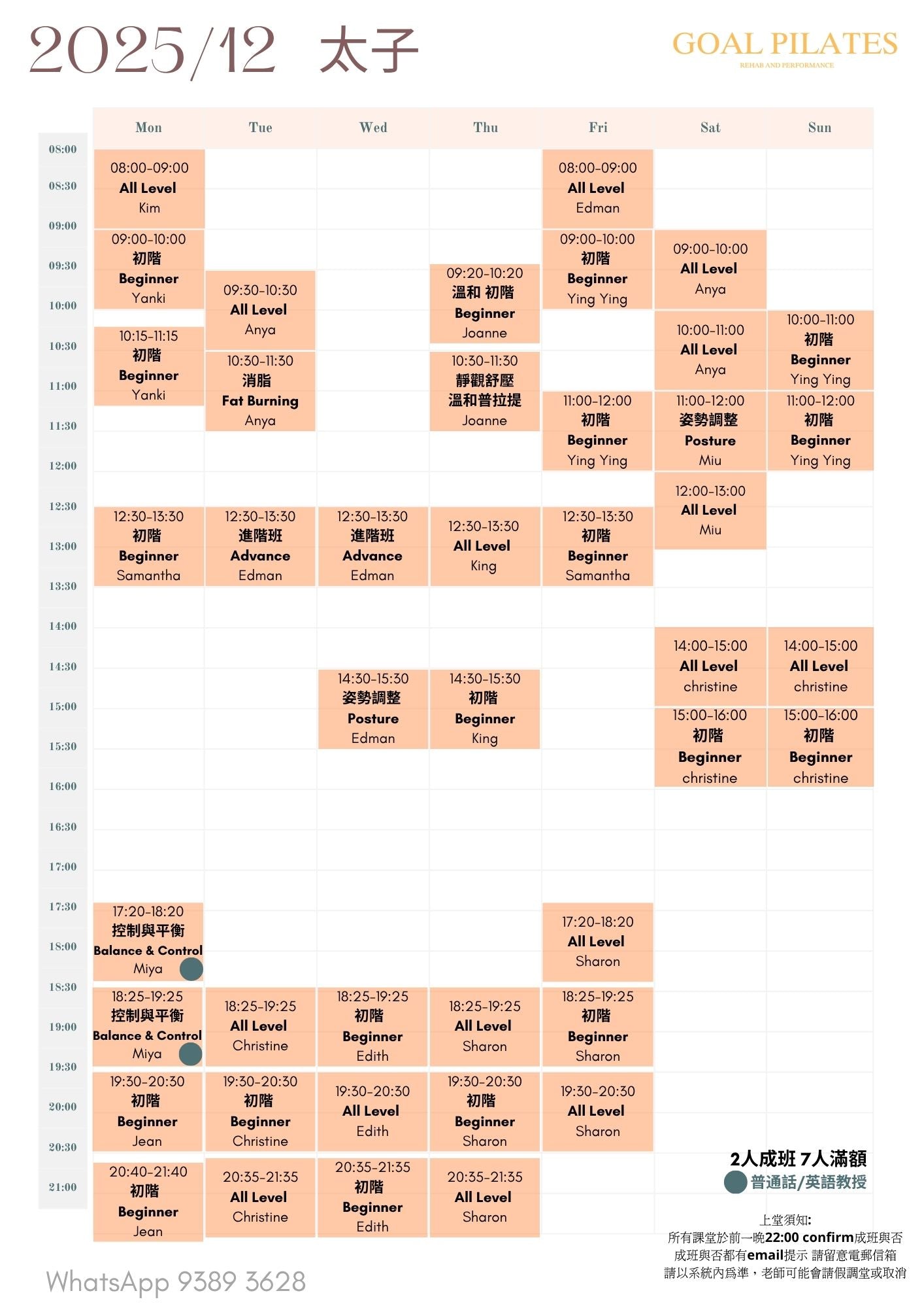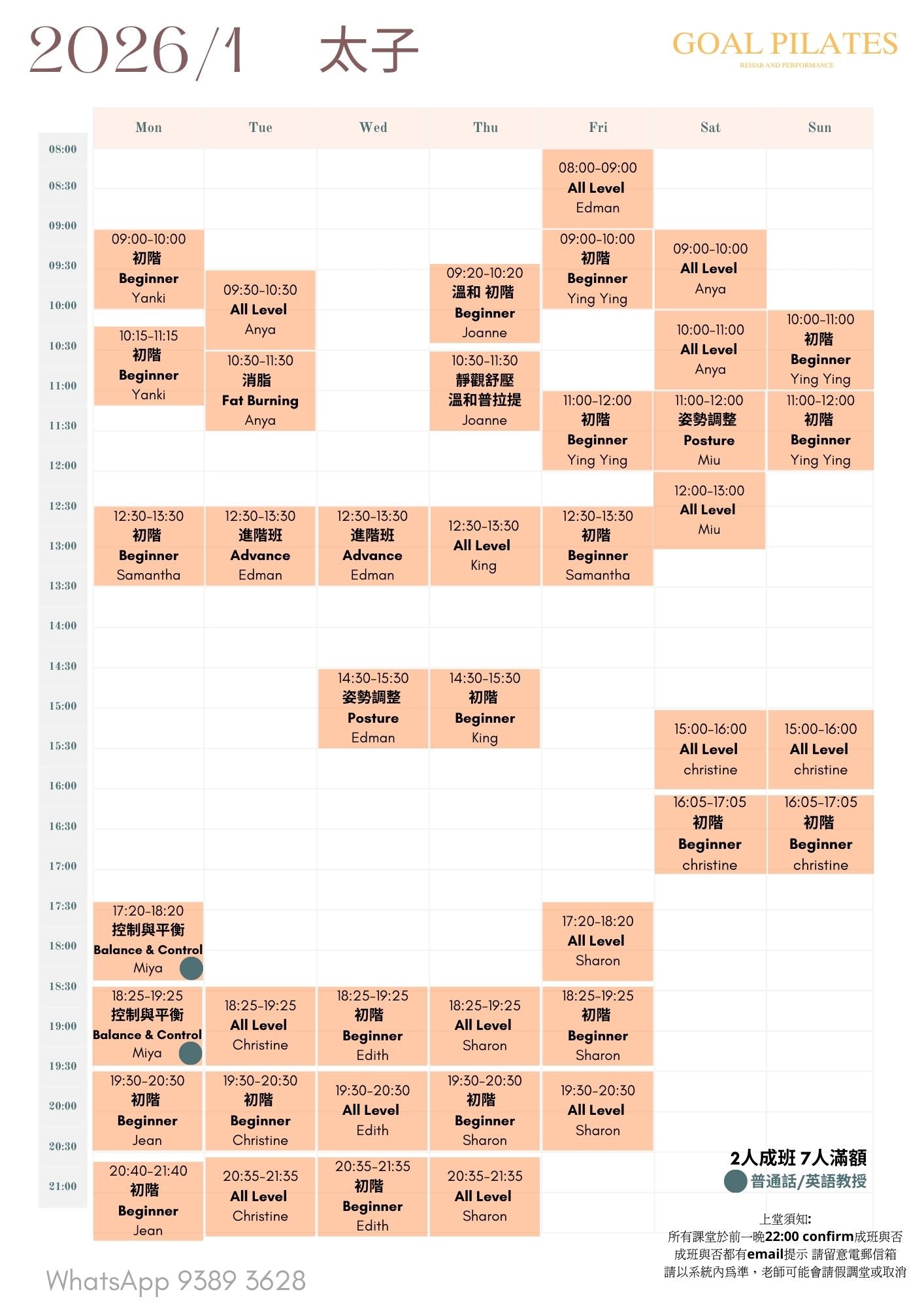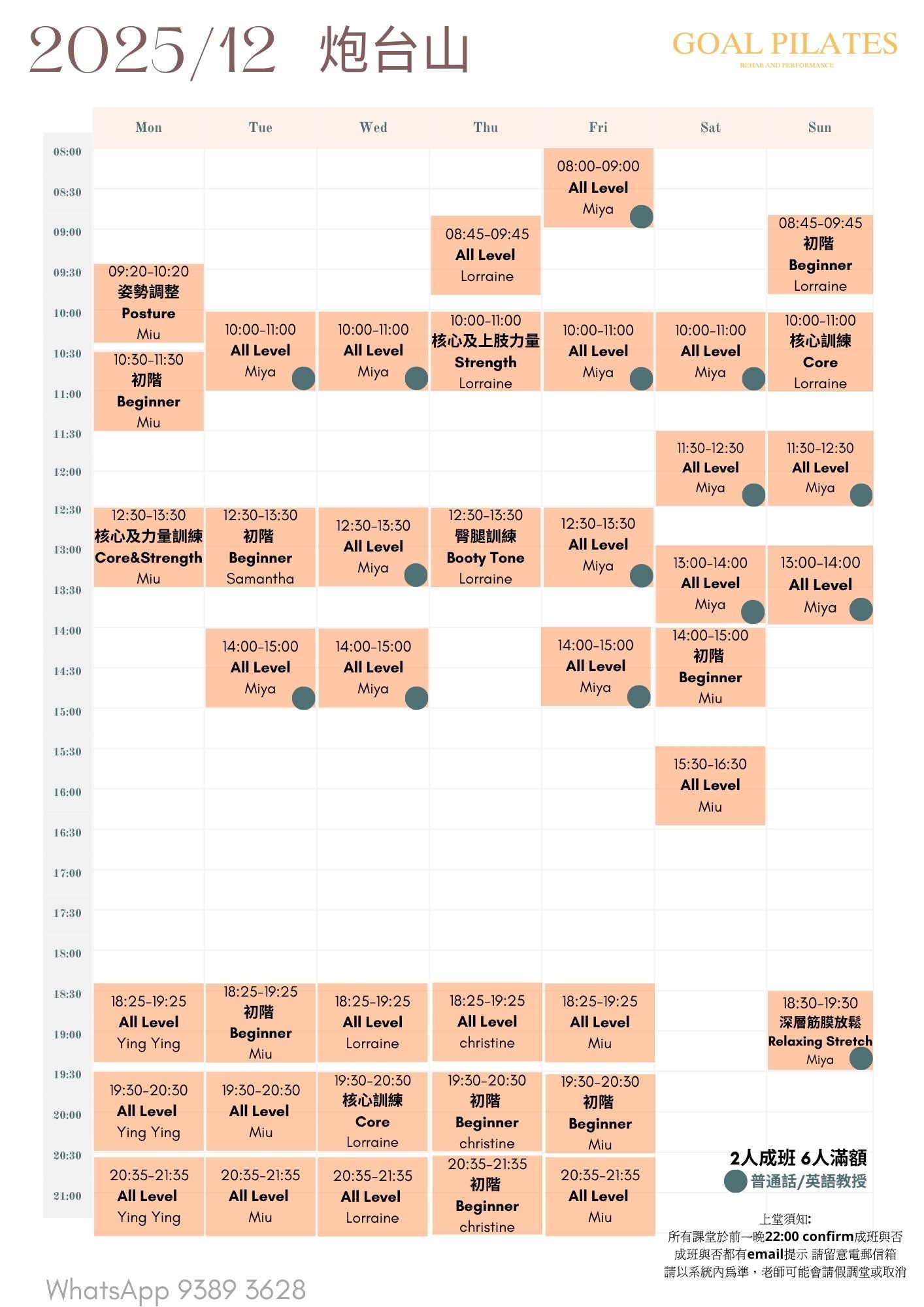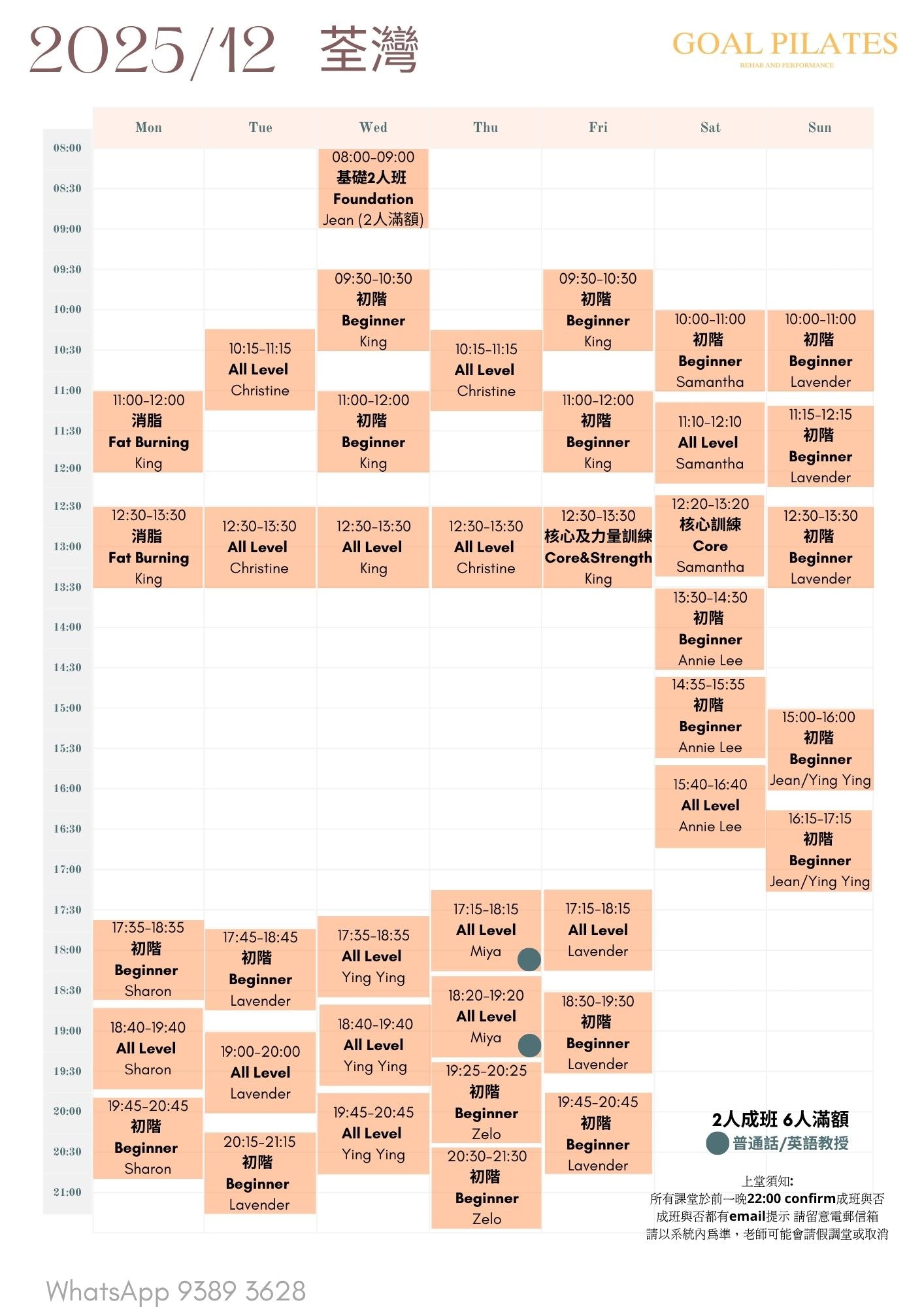 無論你是初學者、運動愛好者,還是專業運動員,Goal Pilates都是你理想的訓練夥伴。我們提供不同小組課堂,協助改善姿勢、增強核心力量、提升柔軟度。從恢復期到強化期,提供安全、有效的運動體驗。打造適合你需求的健康生活,就從這裡開始!