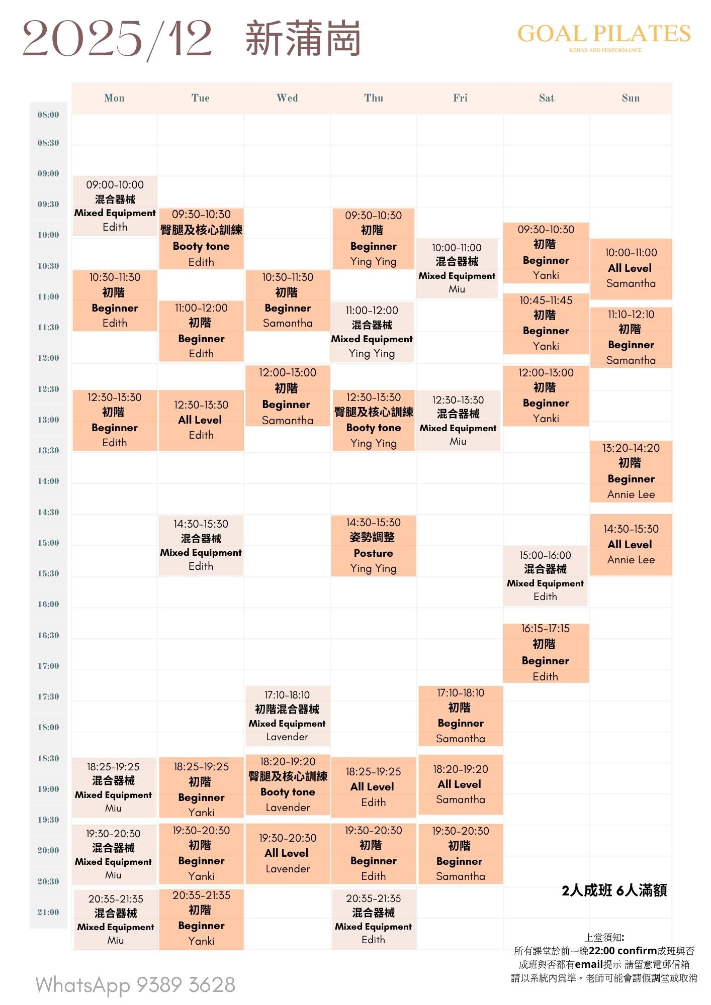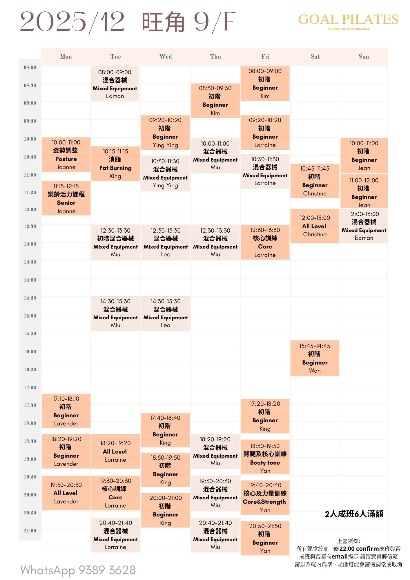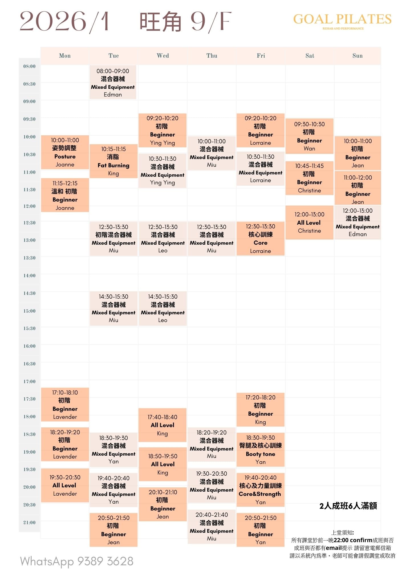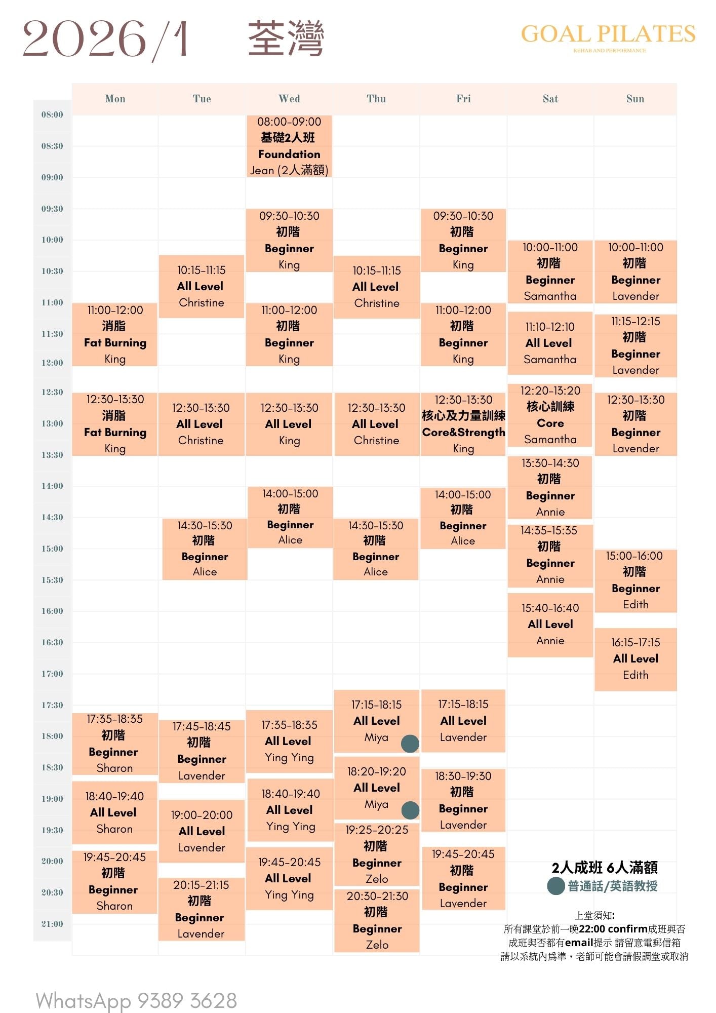 無論你是初學者、運動愛好者,還是專業運動員,Goal Pilates都是你理想的訓練夥伴。我們提供不同小組課堂,協助改善姿勢、增強核心力量、提升柔軟度。從恢復期到強化期,提供安全、有效的運動體驗。打造適合你需求的健康生活,就從這裡開始!